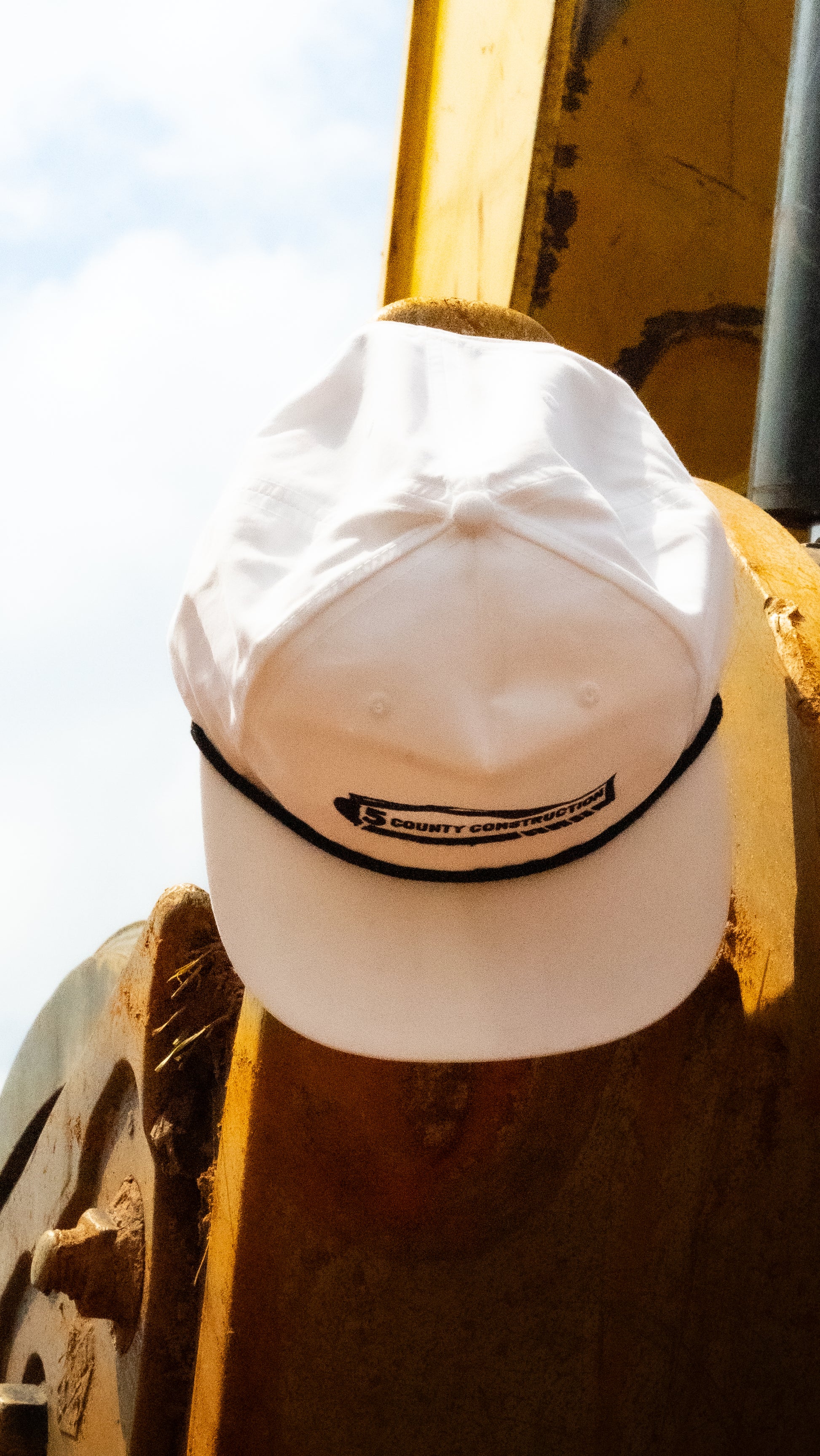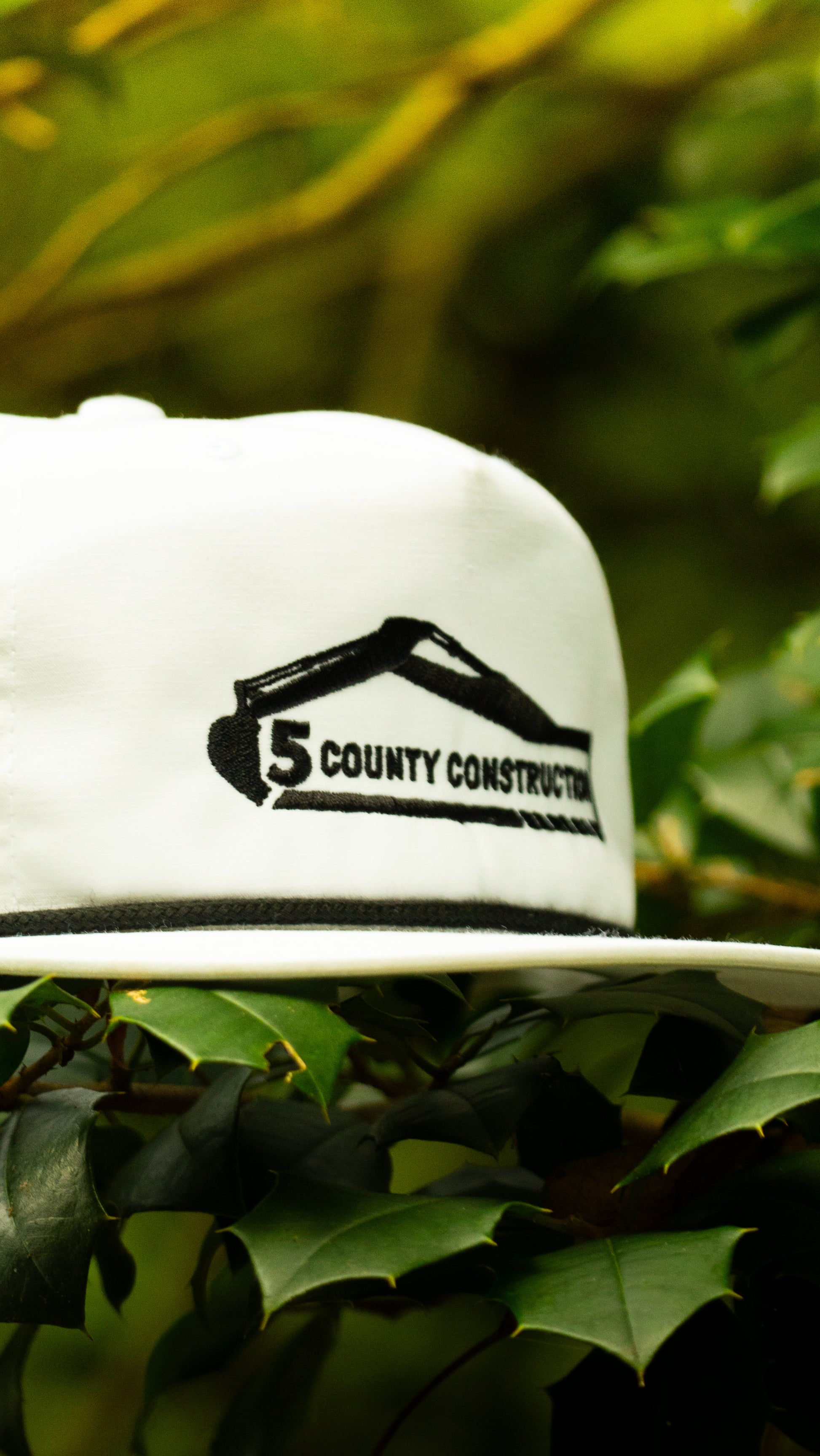 Stay cool and rep your crew with the official 5 County Construction Rope Hat. This classic white snapback features a bold black excavator logo and clean "5 County Construction" lettering, giving it a sharp, professional look on and off the job site. The black rope detail across the brim adds a vintage touch, making this hat a standout piece for workdays or weekends.